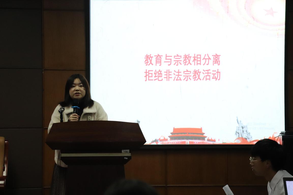 紧接着由团委、员工会指导老师李政老师发言,主题为“教育与宗教相分离,拒绝非法宗教活动”。她教导员工要依法合法的进行宗教活动,指出“老员工是祖国的未来和希望,帮助他们牢固树立马克思主义宗教观,关系高校‘培养什么人,怎样培养人,为谁培养人’”。这让全体团学成员对宗教信仰有了新的认识与了解,本次讲话,不仅对员工干部们进行了思想教育,也对新一届团学提出了严格的要求和美好的祝福。