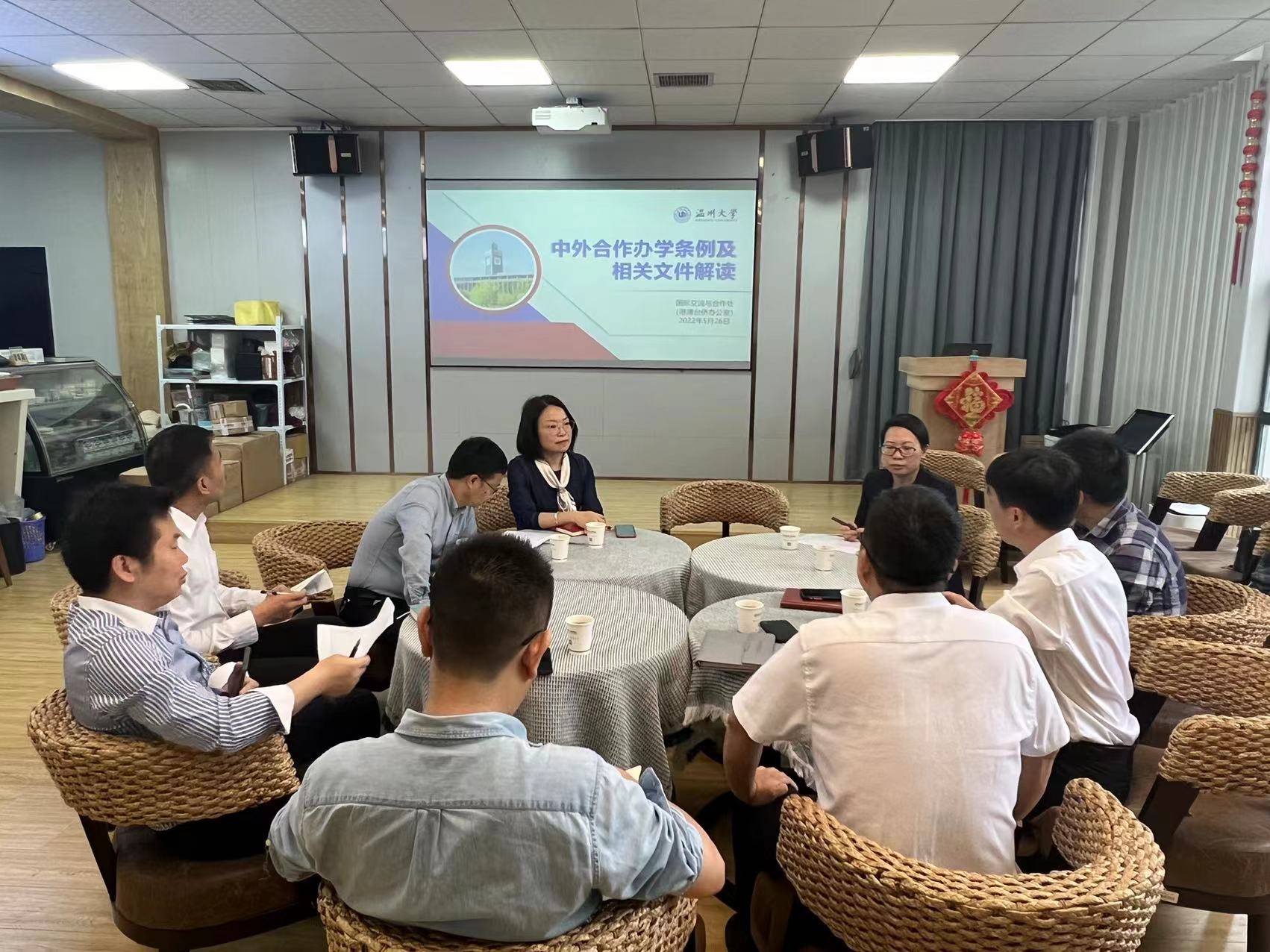 会议由杨植经理主持。杨植经理代表公司对国际交流与合作处黄文浩处长一行的来访表示热烈欢迎。黄文浩处长首先介绍了此次调研座谈的目的以及国际交流与合作处的相关工作安排,并着重介绍了中外合作办学的背景、中外合作办学条例及相关文件解读、浙江省中外合作办学情况以及推进公司中外合作办学工作思路等方面的内容。随后,赵俊亮博士详细介绍了中外合作办学机构办学成本测算。