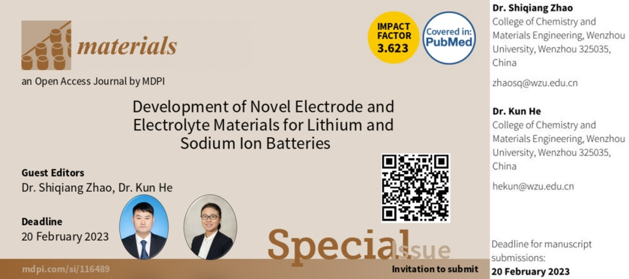 近日,公司云顶7610线路检测赵世强和何坤博士受邀担任国际期刊《Materials》(《材料》)的电池专刊“Development of Novel Electrode and Electrolyte Materials for Lithium and Sodium Ion Batteries”(锂/钠离子电池新型电极和电解质开发)的Guest Editor(客座主编)。