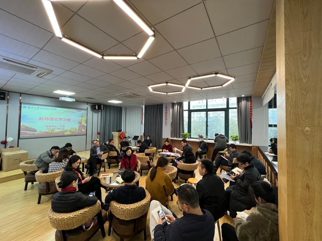 学习会上,各系主任带领老师学习了校领导在新学期教职工大会上的讲话精神、温州市第十三次党代会会议精神等。主要包括深入学习贯彻党的十九大和十九届二中、三中、四中、五中、六中全会精神;深入解读“锚定3456,奋进2022”年度工作主题主线;深入了解公司“十四五”发展规划文件精神。