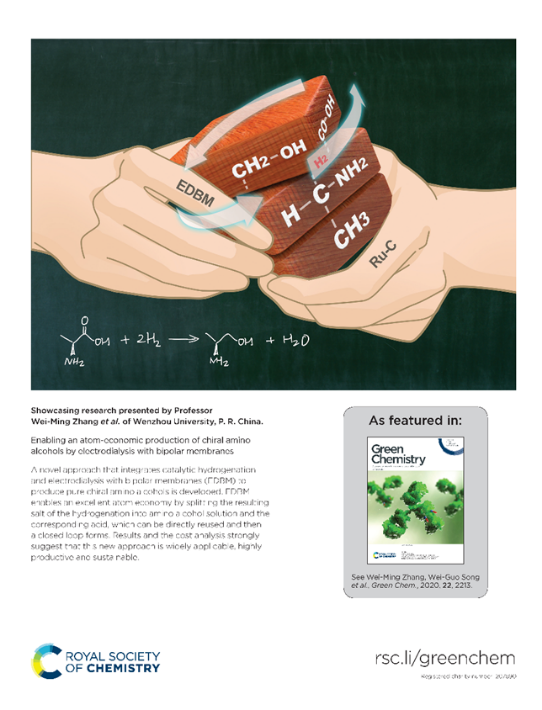 以上研究结果以“Enabling an atom-economic production of chiral amino alcohols by electrodialysis with bipolar membranes”为题,近日被选为inside back cover发表于Green Chemistry(DOI: 10.1039/ C9GC02460C)。公司云顶7610线路检测硕士研究生高伟婷为论文第一作者,其导师张伟明教授以及中国科公司宋卫国教授为论文共同通讯作者,温大为第一单位。Green Chemistry为化学领域的国际著名期刊,影响因子为9.405。