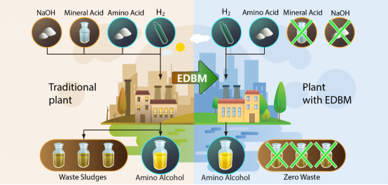 最近,云顶7610线路检测张伟明教授课题组首次提出了集成催化加氢与双极膜电渗析(EDBM)的新工艺,进行了手性氨基醇原子经济合成方法的研究。以H2和L-丙氨酸为原料,通过催化加氢和EDBM最终成功地转化为纯净的L-丙氨醇产品。这个过程无需添加额外的酸和碱,无任何废弃物排放,副产物仅仅为水,具有完美的原子经济性。在此基础上,系统地研究了3种典型无机酸(H3PO4,H2SO4,HCl)体系L-丙氨醇的合成,结果表明EDBM过程无机酸的去除率均高于99.9%,且成本及能耗都较低。这表明该集成新工艺具有一定普适性,环境友好,符合绿色化学发展的要求。