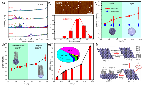 图4. (a)利用液体“特洛伊”催化剂在970°C下生长的SWNTs在不同激发波长下(488nm、532nm、633nm和785nm)的拉曼表征图。(b)利用液体“特洛伊”催化剂在970°C下生长的SWNTs的AFM图(顶部)和催化剂尺寸分布图。(c)催化剂在生长SWNTs前后的粒径变化与温度的关系图,表明催化剂在低温下为固体,在高温下为液体。(d)利用“特洛伊”催化剂生长的SWNTs的直径分布与温度的关系图,低温下为垂直生长模式,高温下为切线生长模式。(e)手性种类与温度变化关系图。尤其是在540°C时,手性种类的演变表明SWNTs手性高度富集。(f)位错引发的热力学成核和动力员工长导致(13,1)和(9,6)SWNTs在540°C下使用固体“特洛伊”催化剂优先生长。