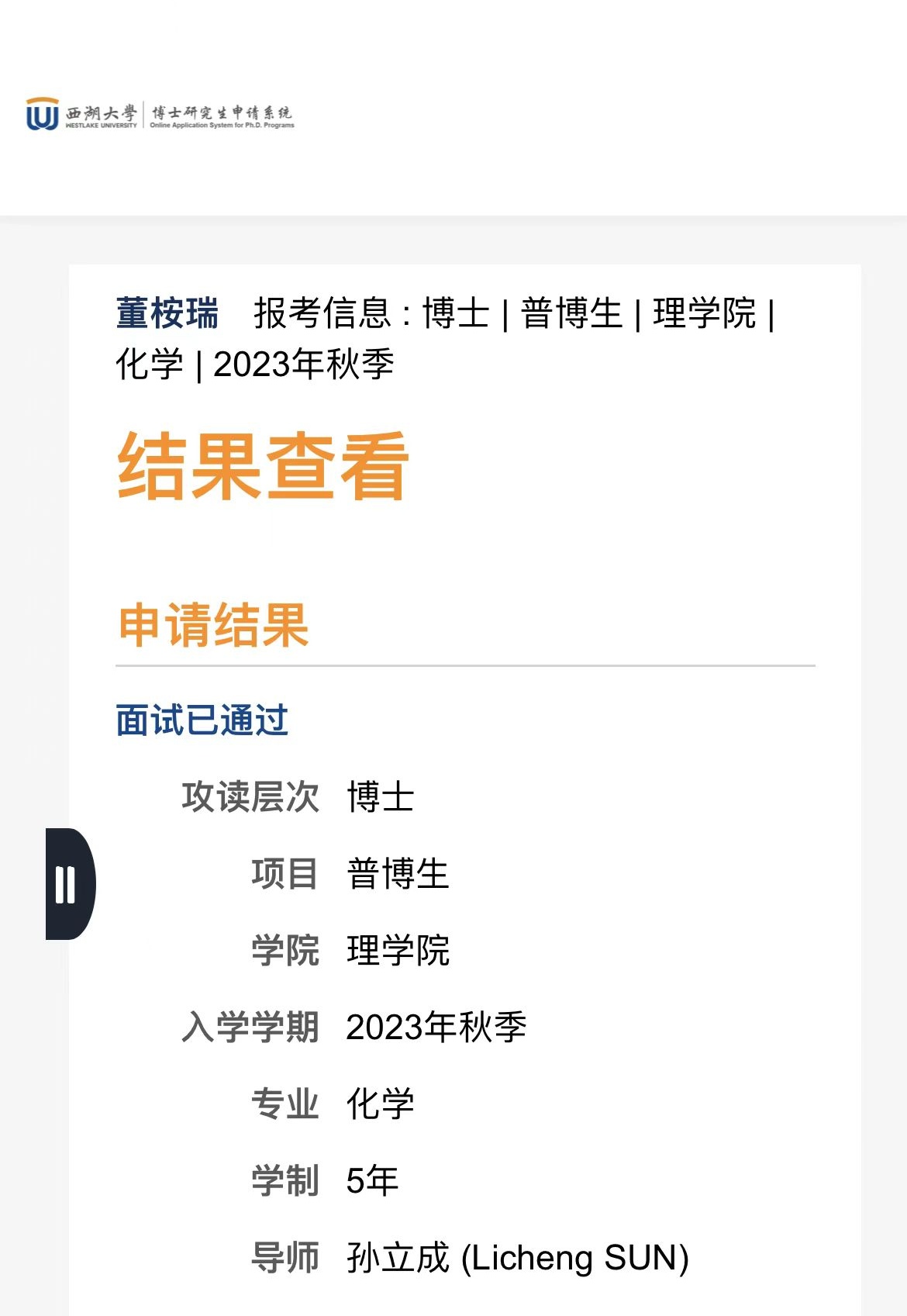 公司2018级应用化学专业员工董桉瑞获西湖大学直博生资格!据悉,此次西湖大学直博生招生共1000余人报名(含研究生),58人进入面试阶段,最终董桉瑞同学凭借个人优异成绩突出重围获得直博生资格!