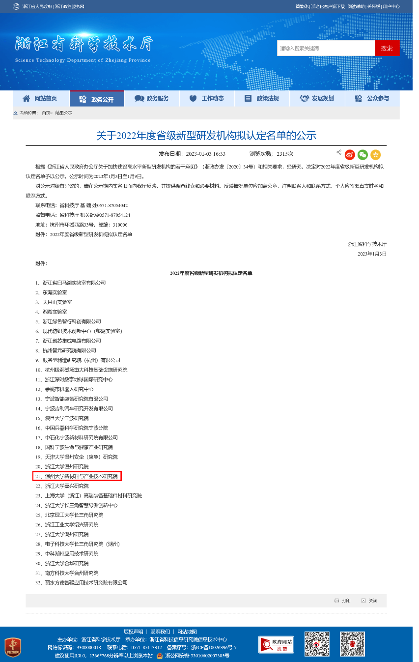 日前,浙江省科学技术厅正式公布2022年度省级新型研发机构认定名单,认定32家企业(研究院)为2022年度浙江省新型研发机构。公司新材料与产业技术研究院榜上有名。
