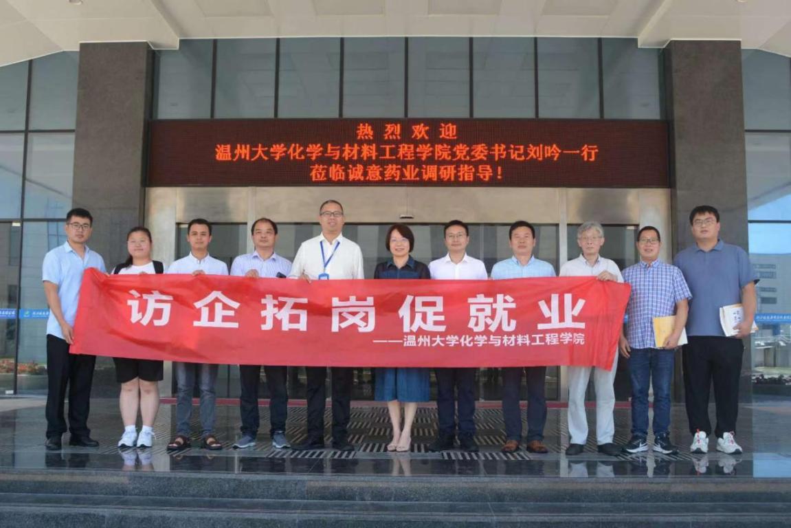 为深入贯彻落实教育部“访企拓岗促就业”专项行动,深化校企合作,6月28日,公司党委书记刘吟、副经理金辉乐、党委副书记周敬业及相关教师等一行11人前往浙江诚意药业股份有限公司调研交流。