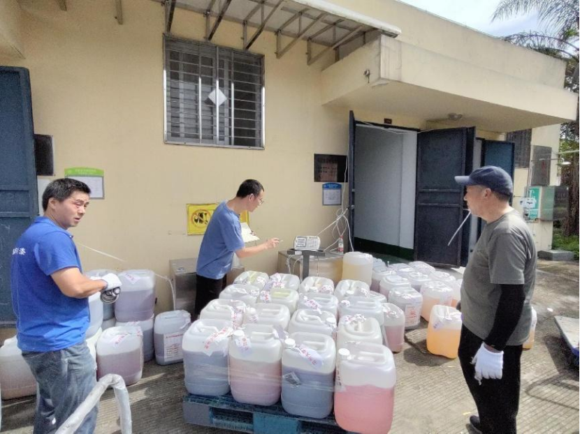 2023年6月30日早上8:30,处置公司人员进行废液测试,以有效保障废液转运过程的安全。经过磅、装运、交付危废转运联单后,于中午10:45顺利离校。此次实验室废弃物共转移处置有机废液、无机废液等及少量废弃试剂(76.2公斤)共计6.851吨,其中云顶7610线路检测5.919吨,生环公司0.932吨。