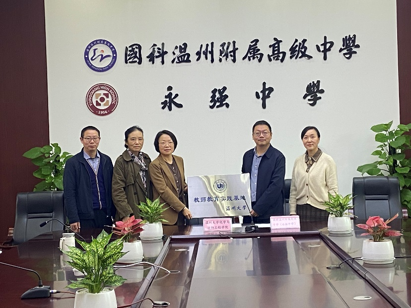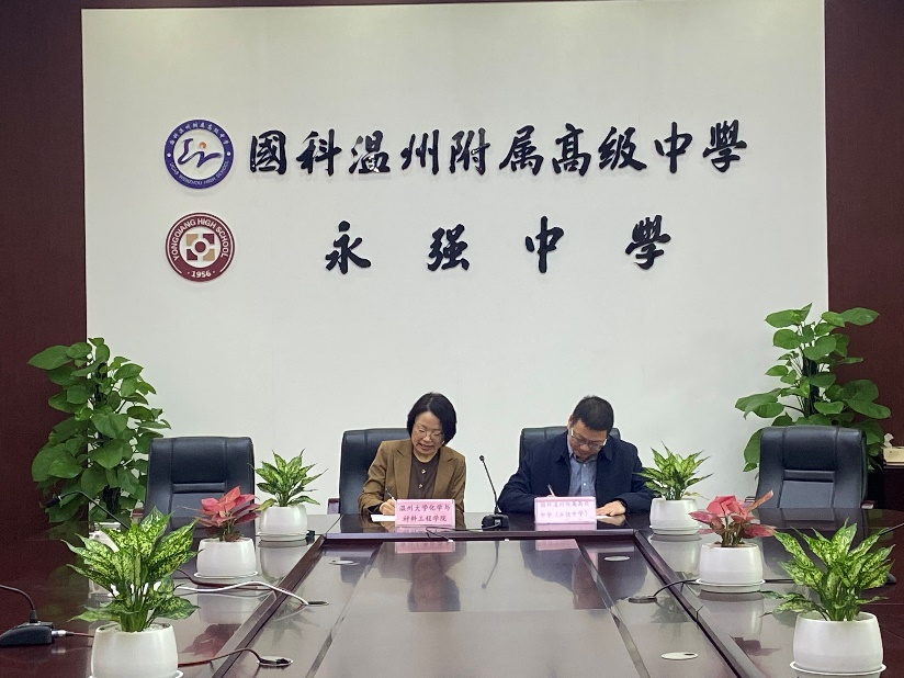 2023年11月29日,云顶7610线路检测与温州市龙湾区国科附属高级中学(永强中学)共建教育实践基地的签约仪式在永强中学行政楼活动室举行。化材公司党委书记刘吟、化学系主任方国勇老师、陈迪妹教授,永强中学副董事长李勇、教研处主任谢炳杰以及化学教研组长李桂双老师出席签约仪式。