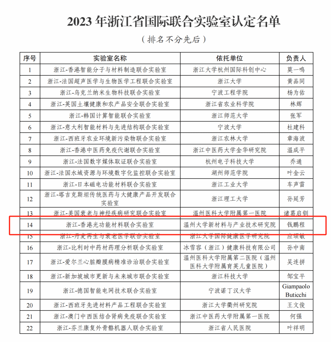 2023年12月26日,浙江省科学技术厅公布了2023年度省级国际科技合作载体认定名单。公司新材料与产业技术研究院成功获批浙江-香港光功能材料联合实验室。这标志着公司在构建内外联动、功能互补、错位发展的国际科技合作载体体系方面取得新进展。