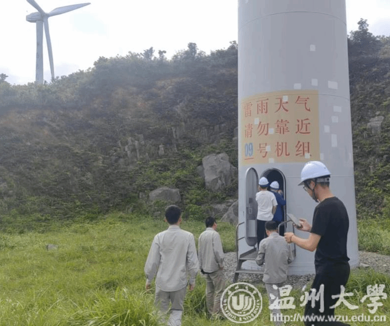 西湾风力发电场负责人导师带领同学们参观了厂内布局,并介绍发电场概况。平阳西湾风电场是温州市首个风电项目,安装有20台单机容量750千瓦级风电机组,配套建设一座35千伏开闭所,年设计发电量3575万千瓦时。随后,同学们参观了风力发电的相关设备,并了解了三相异步电动机、控制柜及配电装置等工作原理。在风力发电机组的塔筒参观环节,同学们深入了解了风力发电机组的叶轮、机舱、塔筒等基础部件,以及风力发电的基本原理。同学们就发电效率相关影响因素提出疑问。负责人导师为员工悉心解答,并进而讲述了风力发电的优缺点,即虽然风力发电有能源充足、不消耗燃料、无环境污染等优点,但其受地域影响大的缺点也不容忽视。在本次实习过程中,同学们在实战场景中将理论知识和实际相结合,更好地学习了风力发电的基本原理,收获颇丰。