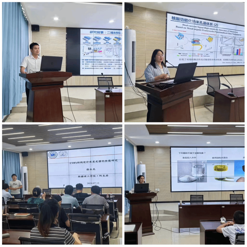 相互介绍公司总体情况后,双方开展“党建+学科”共建交流活动,援疆团队成员分别作学术前沿报告。邹超作《抑制非辐射复合实现高效蓝光钙钛矿LED》报告,张礼杰作《二维半导体控制生长与光电性能研究》报告,徐全龙作《COFs结构设计及其光催化性能研究》报告,刘楠楠作《仿生微纳米孔道生物传感器的制备及其电化学性质研究》报告。翟兰兰作《掀起你的盖头来》趣味少儿科普讲座,点燃该校教工子女“小小科学家”梦想。