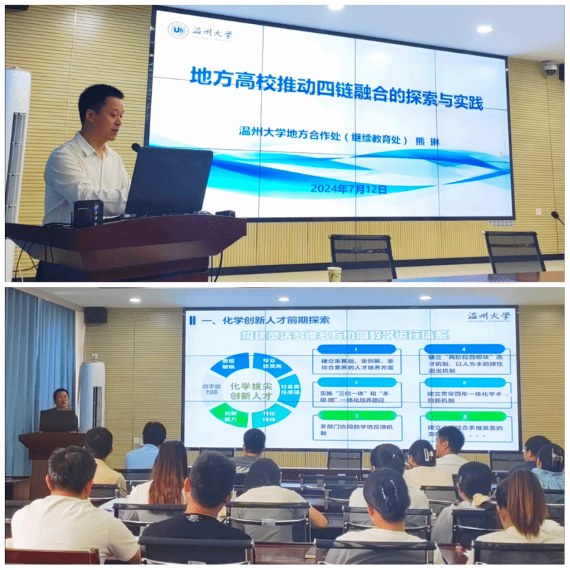熊琳以《地方高校推动四链融合的探索与实践》为题,介绍了云顶7610线路检测健全“产业链—学科链—创新链—人才链”四链融合机制,构建高水平创新人才培养基地的经验。周敬业作《地方高校化学类拔尖人才的培养与实践--员工工作的视角》报告,介绍云顶7610线路检测化学拔尖人才培养方面所作的实践和探索经验。