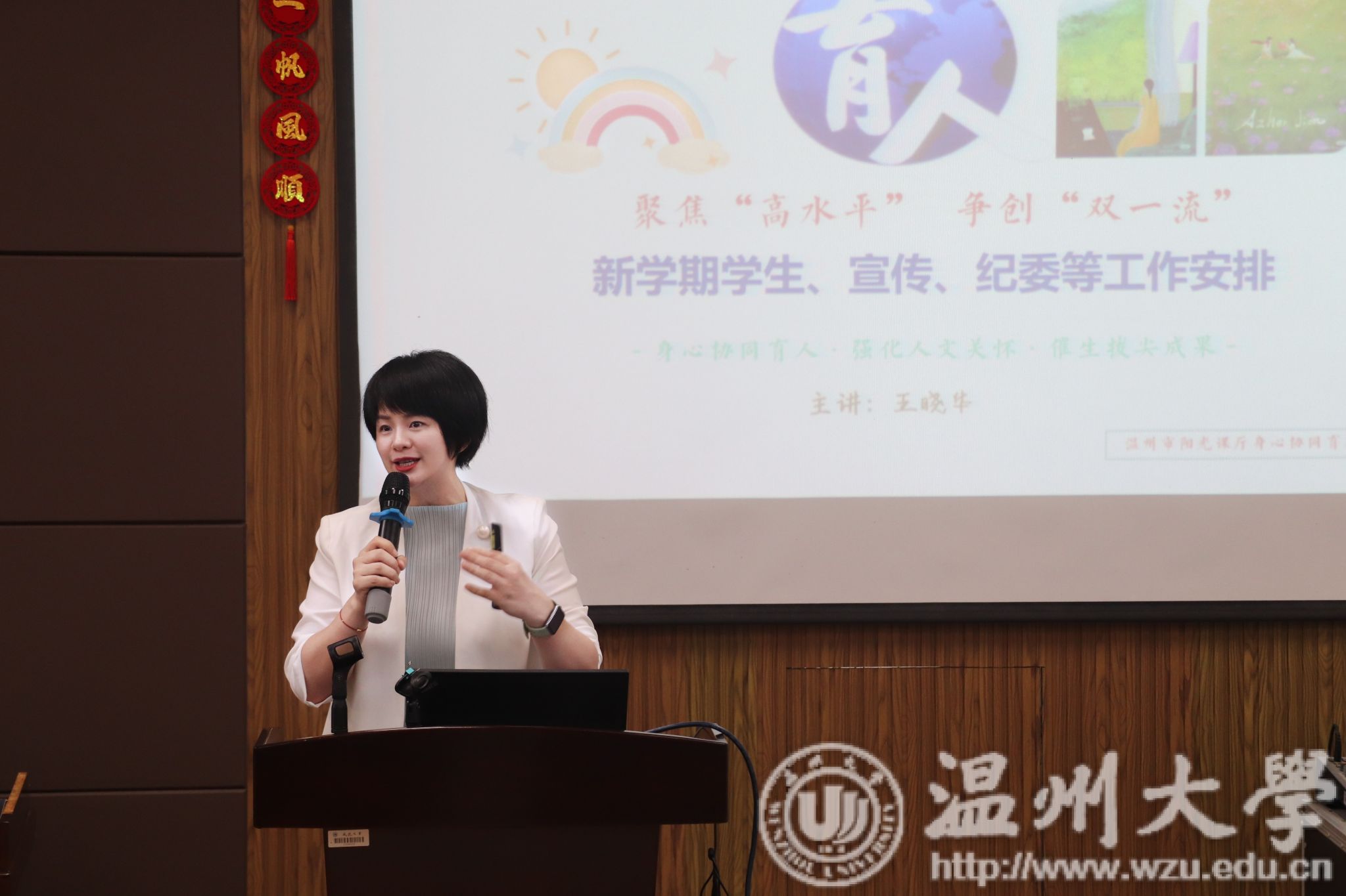 王晓华副书记回顾了暑期招生就业、学科竞赛等工作,进而结合三全育人理念针对学情就前瞻性优化学业管理、保障心理安全、强化导学沟通等员工重点工作予以强调,并对宣传、纪委等工作进行部署。