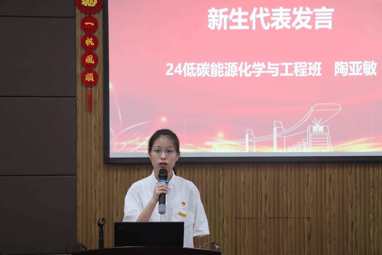 新生代表24低碳能源化学与工程班陶亚敏同学发言。她感恩在温大云顶7610线路检测度过的本科时光,是公司的整体学术氛围帮助自我不断坚定科研信念、锻炼无畏勇气,敢于挑战未知领域,并积极表态要扎根于学术沃土、接续探索钻研,努力为服务国家战略发展提供可行且高效的解决方案。