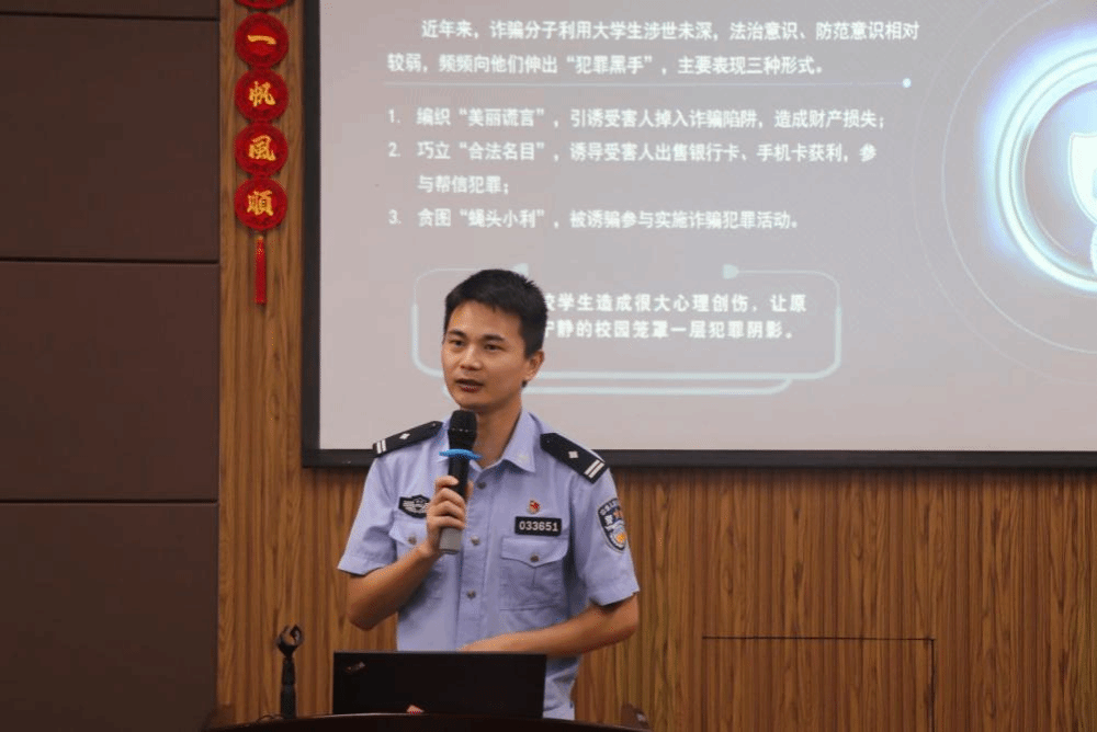 史铁军警长作为心理安全导师代表,为现场300多名员工作题为《身心协同 安全先行》的专题安全形势政策讲座。他从网络诈骗、毒品预防、杜绝邪教、平安出行以及实验室安全五位一体的角度切入,辅以宣教视频以及案例分析,详细讲解了在日常生活中如何防止各类侵害,确保自身安全无虞,为现场的2024级新生注入一剂满满的安全自护强心针。