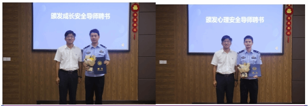 邹超书记为陈海敏副所长、史铁军警长分别颁发了成长安全育人导师、心理安全育人导师聘书,期待他们以专业智见与公司全员育人链条一同持续为公司员工五育并举、拔尖成才、全面发展提供有力保障支持。