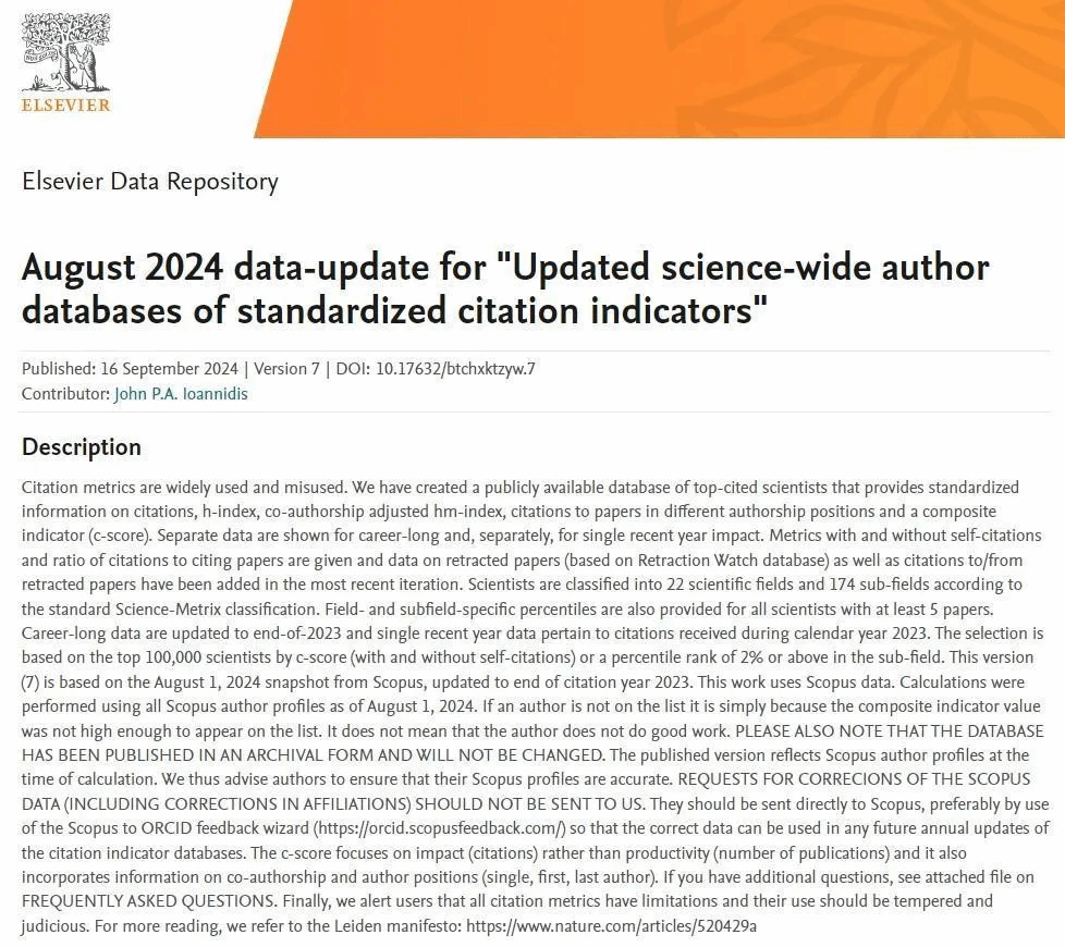 榜单以Scopus数据库为依据,统计的论文涵盖SSCI、SCI、EI期刊、EI会议,再基于引用次数、H因子、HM因子等6种指标,从22个领域和174个子领域,近700万名科学家中遴选出世界排名前2%的科学家,旨在提供一个科学家长期科研表现的衡量指标,更客观、更真实地反映科学家的影响力。分为“终身科学影响力榜单”(Career-long impact,关注学者整个学术生涯的综合影响表现)和“年度科学影响力榜单”(Single-year impact,聚焦学者上一年度学术成就)。其中终身科学影响力榜单(Career)统计科学家职业生涯期间的综合表现,而年度科学影响力榜单(Singleyr)则更聚焦上一年度的学术影响力。入选榜单,意味着该学者在其研究领域具有较高的世界影响力。