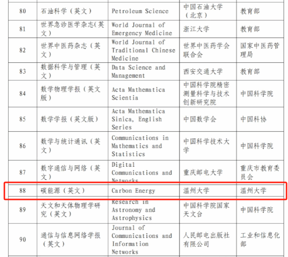 Carbon Energy 期刊入选中国科技期刊卓越行动计划二期项目