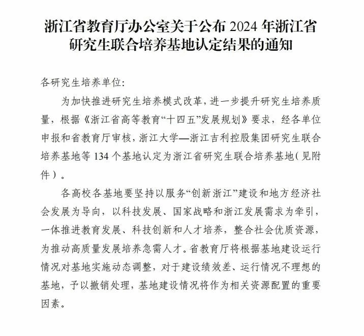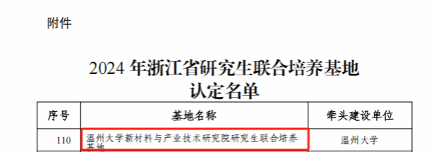 近日,浙江省教育厅发布《关于公布2024年浙江省研究生联合培养基地认定结果的通知》的名单,云顶7610线路检测新材料与产业技术研究院研究生联合培养基地成功认定为省级研究生联合培养基地。这一认定标志着公司在新材料、新能源领域硕士研究生联合培养、导学模式创新方面迈出了重要一步,彰显了公司在产教融合、协同创新方面的显著成效。