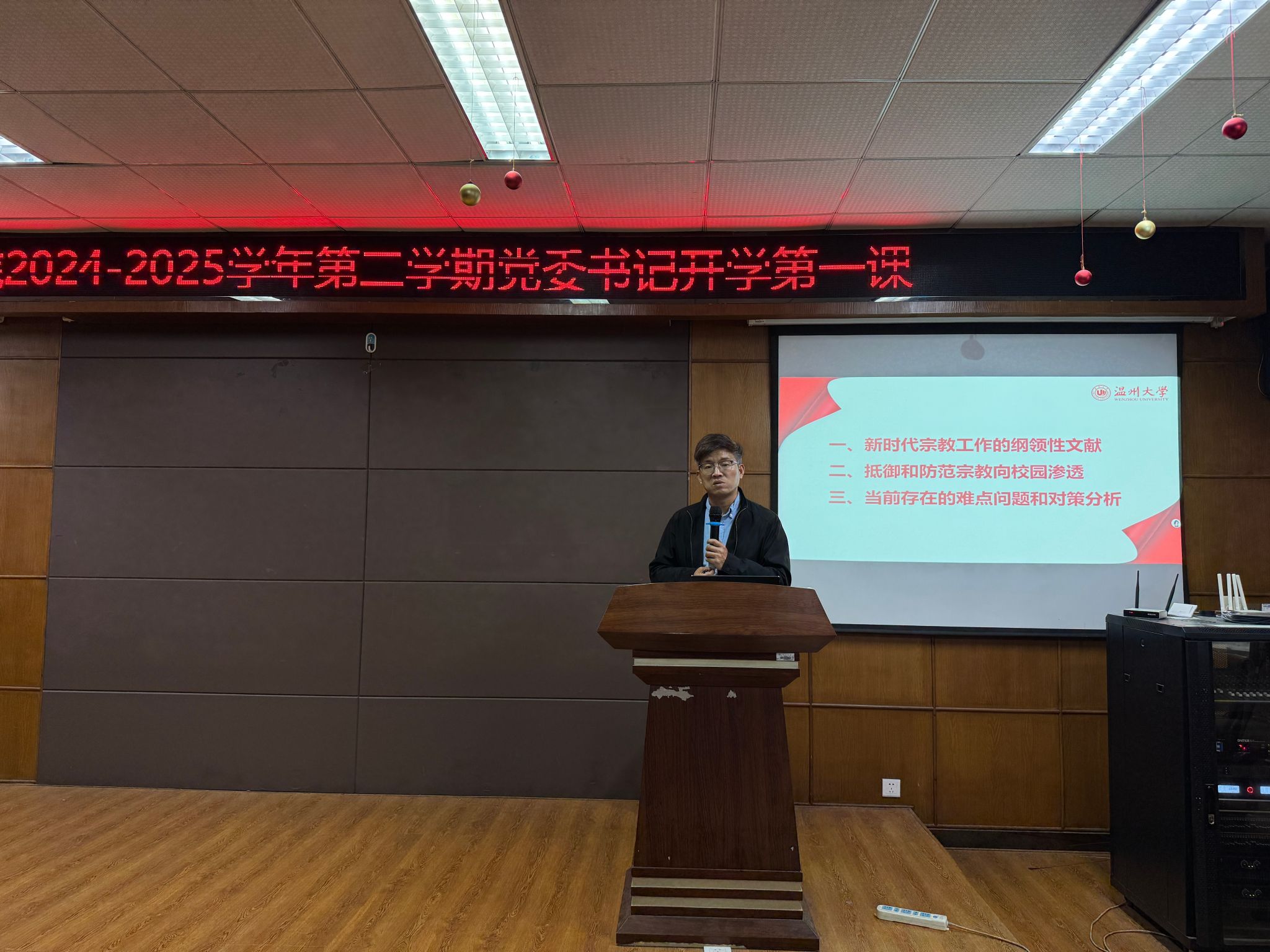 邹超书记从“新时代宗教工作的文件和法律法规、抵御和防范宗教向校园渗透、新时代老员工应该怎么做”三方面系统解读新时代宗教工作文件法规,强调依法管理宗教事务对维护社会稳定、保障教育科技发展环境的重要性,为教育强国、科技强国筑牢法治基石。针对宗教向校园渗透问题,他指出校园是培育创新人才、开展科学研究的关键阵地,抵御宗教渗透是守护学术净土、保障人才培养质量的必要举措,关乎科技强国战略的人才根基。