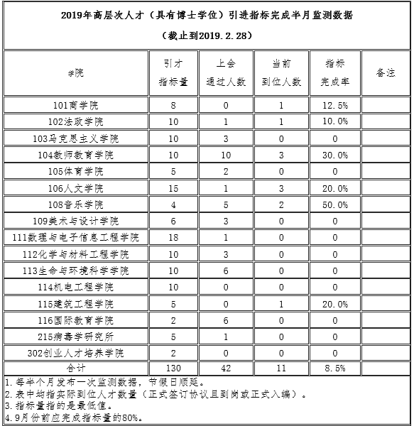 实施“英才汇聚”工程、大力引进高层次人才是公司推进“升博”行动计划和省重点高校建设的重要支撑。为进一步做好相关工作,根据公司统一部署,人事处将统计公布“高层次人才(具有博士学位)引进指标完成半月监测数据,以供各公司、部门及时掌握有关信息,及时推进人才引进工作,高质量完成人才引进工作任务。现将2019年1月1日至2019年2月28日的数据公布如下: