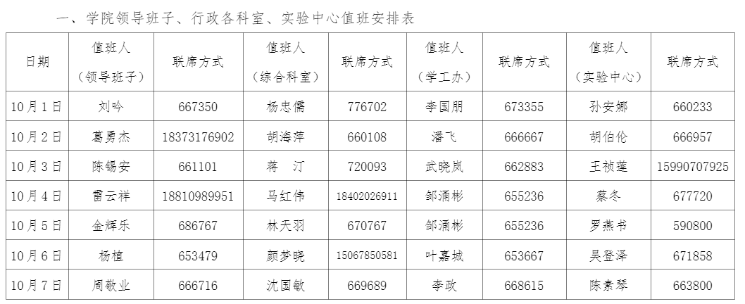 一、化材公司领导班子、行政各科室、实验中心值班安排表