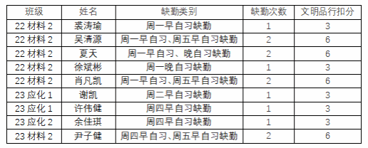 2、根据《云顶7610线路检测大一、大二早晚自习管理规定(201809修订)》,1次早、晚自习缺勤扣3分,学业发展部将在每周在“云顶7610线路检测”微信公众号平台公布本周考勤结果,如对公布的考勤结果有异议请当周周五下午4:30前到员工科办公室11B223说明情况,过时无效。22级、23级联系邹培杰老师。