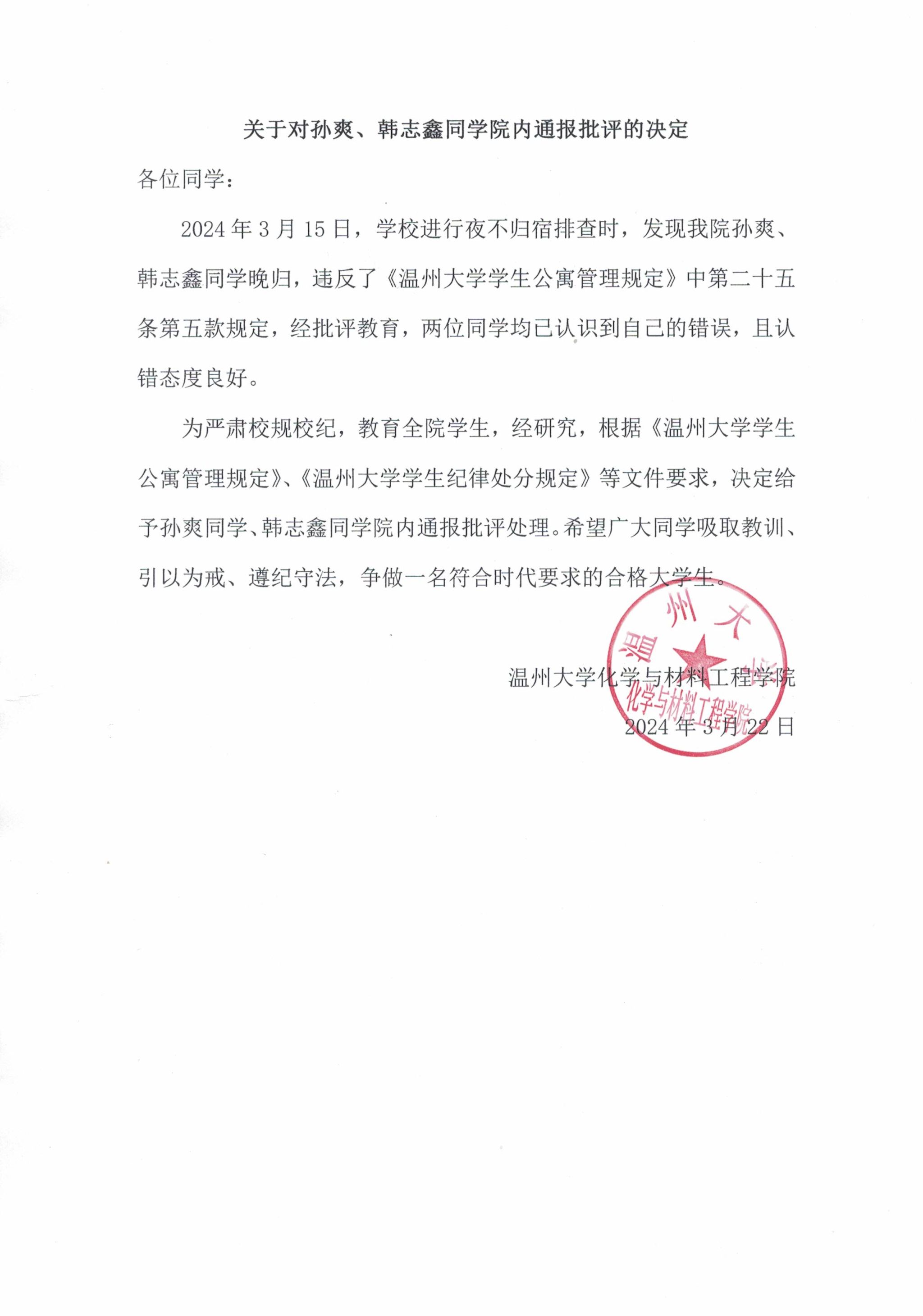 关于对孙爽、韩志鑫同公司内通报批评的决定