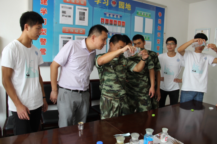 为突出公司特色,展示化材风貌,实践队为消防官兵们准备了“水中花园”、“大象牙膏”两个具有观赏性的化学实验。消防官兵面对神奇的化学现象赞叹不已,在不经意间,消防官兵已经参与和融入其中,感受到了化学的奇妙。