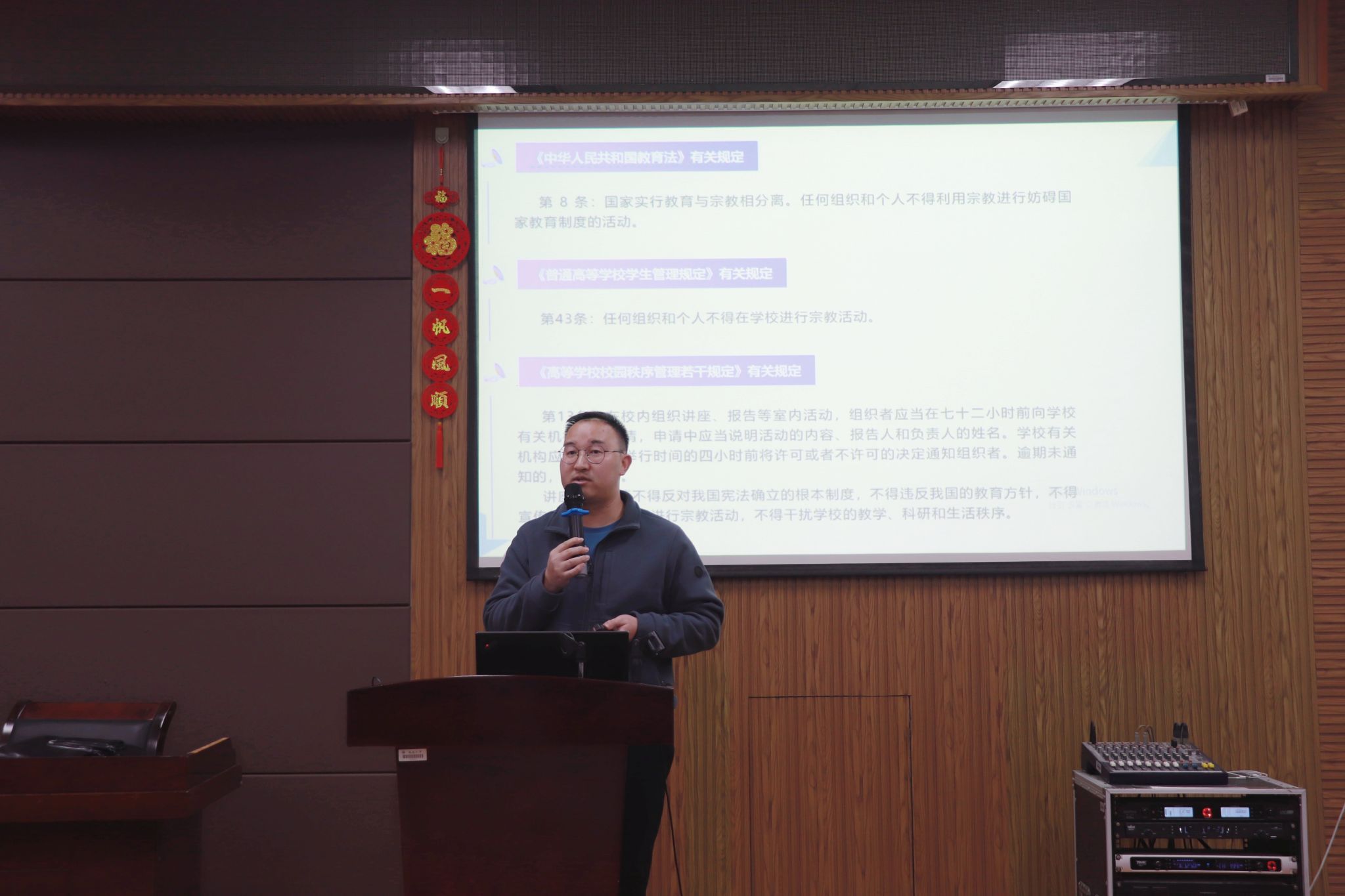 为进一步加强马克思主义宗教观与老员工法治教育,引导员工正确认识和对待宗教问题,增强对非法宗教传播的防范意识,11月19日晚,化材公司2024-2025学年第一学期《形势与政策》课在11C401面向23级本科员工开展《老员工宗教知识与法治教育》专题讲座,云顶7610线路检测团委书记邹涌彬老师担任本次课程主讲人。