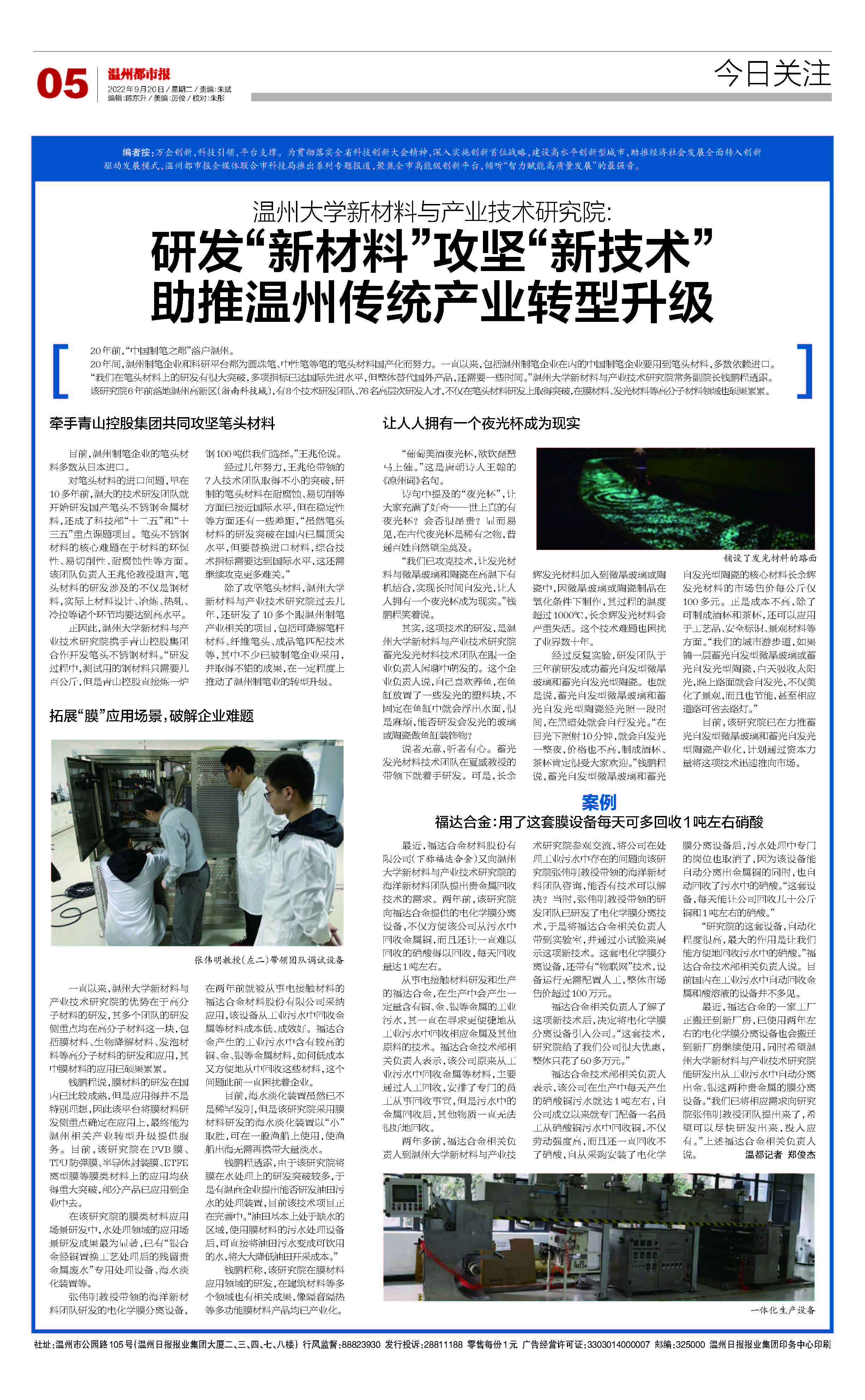 该研究院6年前落地温州高新区(浙南科技城),有8个技术研发团队、76名高层次研发人才,不仅在笔头材料研发上取得突破,在膜材料、发光材料等高分子材料领域也硕果累累。