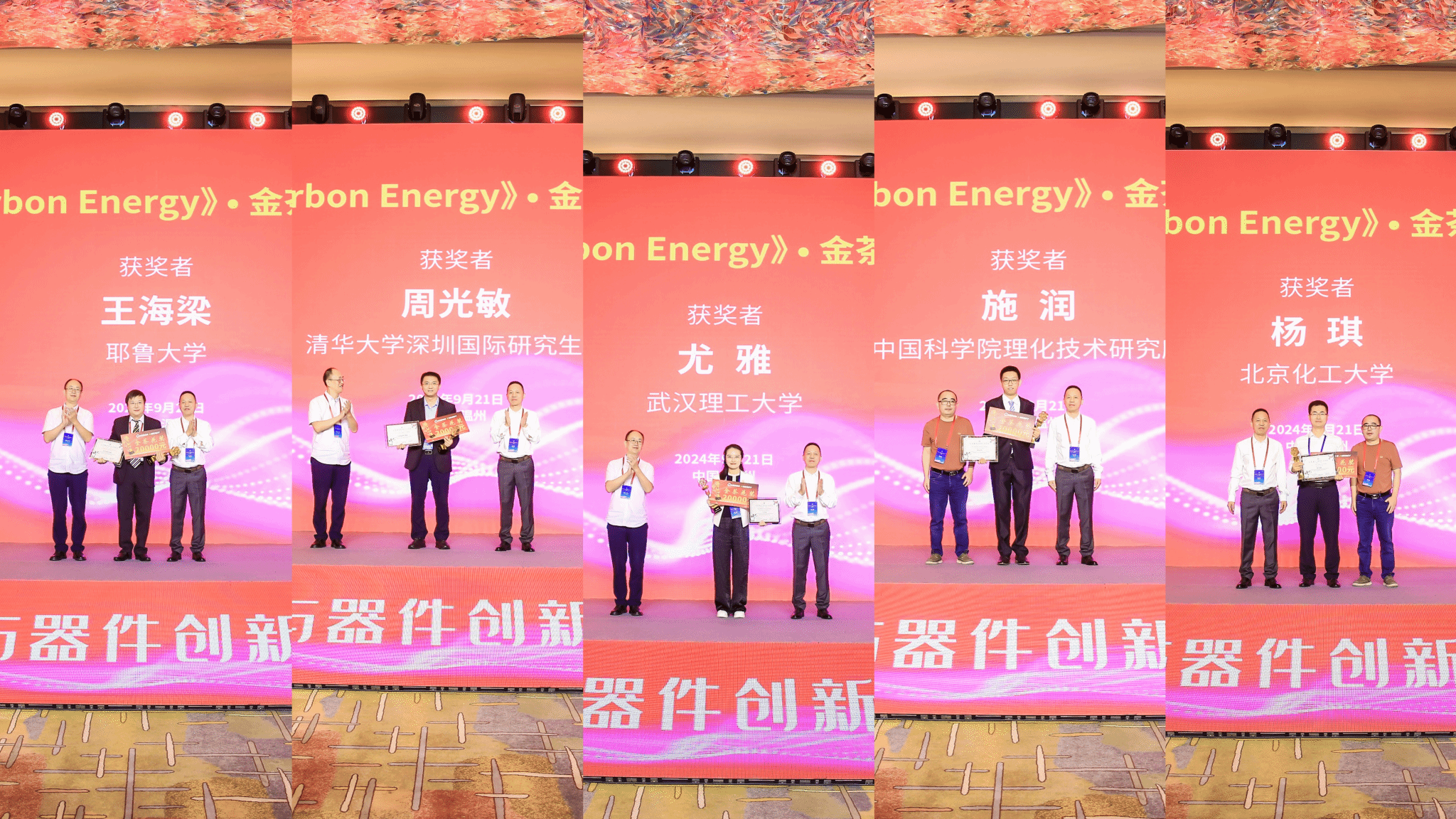 开幕式现场举行了中国科技期刊卓越行动计划“高起点新刊”《Carbon Energy》(碳能源)•金茶花奖颁奖仪式,该奖项为表彰在前沿研究领域作出贡献的40周岁以下的优秀青年科学家,共有耶鲁大学王海梁教授、清华大学周光敏教授、武汉理工大学尤雅教授、中国科公司理化技术研究所施润研究员、北京化工大学杨琪教授5位青年学者获奖。