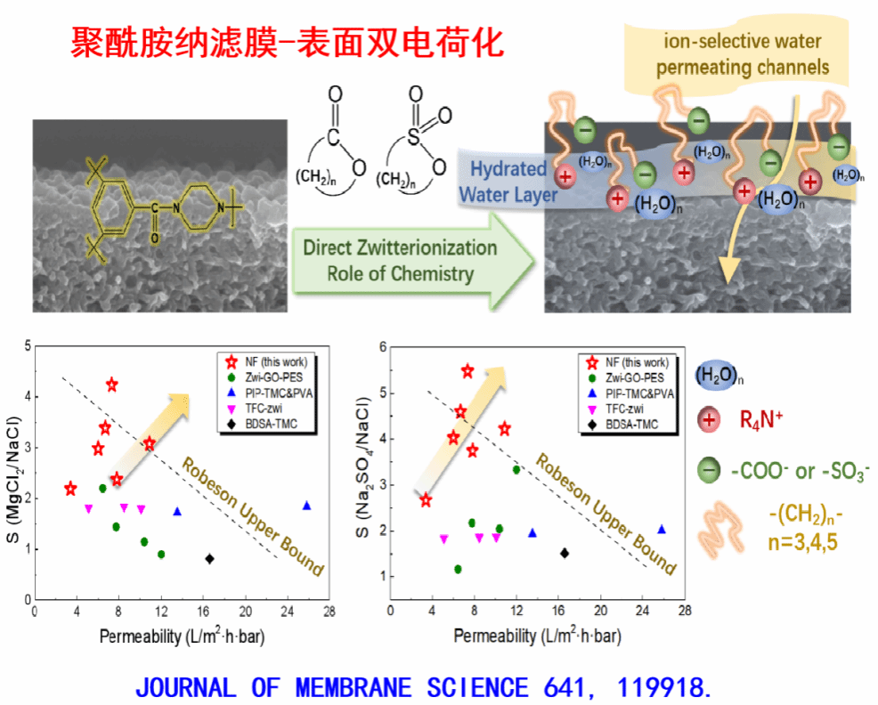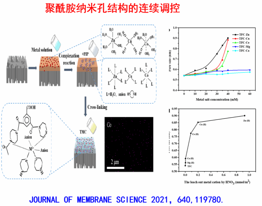 他通过在界面聚合中引入过渡金属二价离子盐,成功实现了聚酰胺分离层纳米孔径大小的连续调控(JOURNAL OF MEMBRANE SCIENCE 2021),而且通过耦合反向扩散ZIF纳米粒子的原位生长,实现了纳米孔径的自密封。在保持高膜水通量的条件下,提升膜的盐截留性能。(Advanced Materials Interfaces, 2019)。