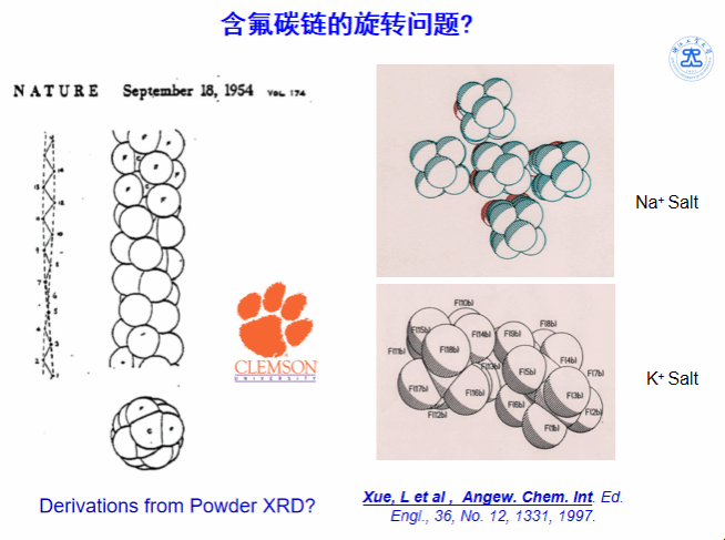 由于含氟聚合物材料的优异性能,含氟膜在氯碱工业,能源工业,环保产业得到广阔的应用,是“膜技术”的前沿热点。 但是,长期以来,人们不能解释为什么相互不粘的含氟碳链如何构成超稳定的聚合物膜基础相。 薛博士是国际上第一个用单晶结构数据发现紧密堆积结晶结构中的不旋转,颠覆了整个科学界对含氟聚合物分子链构象的看法(Angew. Chem. 1997)。他的实验证明表面非结晶的含氟链能由于构型旋转具有不粘性,结晶的含氟链构型不旋转具有强相互作用,为解释含氟碳链的多模式相互作用和含氟聚合物膜基材的高稳定性和表面不粘性,提供确凿的分子水平依据。