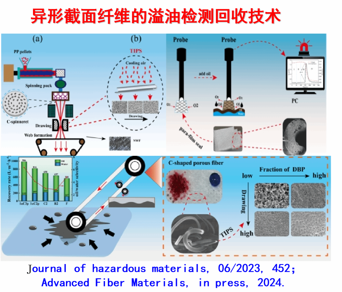 回国后通过耦合相分离技术,独立开发了国际领先的具有亚微米孔结构的C型截面异形纤维无纺布,成功应用于海洋溢油监测和回收(Journal of Hazardous Materials 06/2023;Advanced Fiber Materials 2024)。