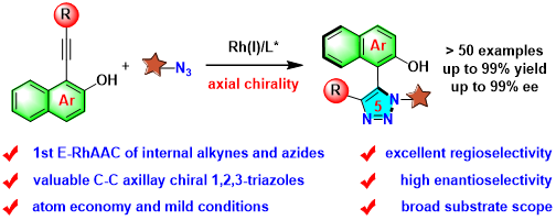 近年来,轴手性化学得到了人们的广泛关注。人们利用不同的策略构建了众多轴手性骨架,并成功地应用于药物化学以及不对称催化中。这些方法普遍用于构建六元杂芳香双环骨架的合成,对于五元环轴手性骨架的报道仍旧较少,究其原因在于该骨架旋转能垒较低,不够稳定。尽管如此,国内谭斌、石枫和李兴伟等课题组利用各自的策略实现了吲哚和呋喃C-C轴手性的高效高选择性的合成。但是,对于含有三氮唑骨架的五元杂环C-C轴手性的构建,且手性轴直接建立在三氮唑环上的研究及其有限。相比于C-H活化和拆分的策略,原子经济性的构建三氮唑C-C轴手性的报道极具挑战。更重要的是,利用click反应的策略高效高选择性地合成三氮唑C-C轴手性目前尚未报道。