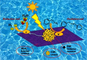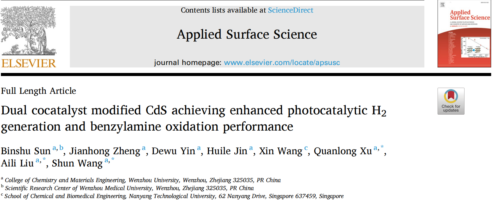 近日,公司徐全龙副教授在国际著名化学期刊《Applied Surface Science》发表了题为”Dual cocatalyst modified CdS achieving enhanced photocatalytic H2 generation and benzylamine oxidation performance”的论文。通过微波辅助合成的方法合理制备出三元PdS/CdS/MoS2光催化剂。在光催化反应过程中,CdS的光生电子会转移到作为还原助催化剂的MoS2表面参与还原反应,而其空穴会迁移到作为氧化助催化剂的PdS表面参与氧化反应,从而实现了电子和空穴对在空间上的分离。此外,水还原产生氢气的反应和苄胺氧化产生硝基苯的反应分别发生在不同的助催化剂表面,这有助于充分利用光生电子和空穴对,且具有低的反应活化势垒,从而表现出优异的光催化水分解产生氢气和苄胺氧化性能。