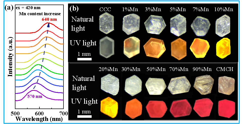 近日,云顶7610线路检测潘跃晓教授指导的研究生黄叶鑫以无机卤化物钙钛矿CsCdCl3为基质,通过Mn2+离子掺杂,诱导CsCdCl3钙钛矿晶体结构收缩,随着Mn2+掺杂浓度的进一步增加,导致向CsMnCl3.2H2O的结构转变,进而研究了掺杂浓度引发对与相变而引起了发光性质变化的规律。通过调节Mn2+掺杂浓度,可调控晶格畸变程度进而实现了发射波长从570 nm到640 nm的移动,并阐述了CsCdCl3:Mn2+的发射机理。CsCdCl3:Mn2+在360、370、420、440 nm不同的激发波长下,均呈现单一的橙红色发光,由此可推测在晶体内只存在一种发射格位,并且该结果可能归因于Mn2+的(4T1(G)-6A1(S))轨道跃迁,从而呈现典型的橙红色发光。