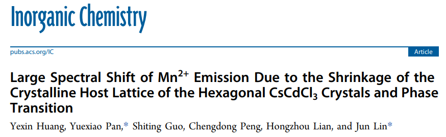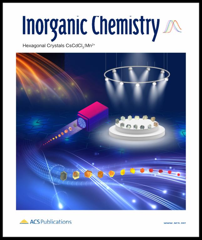 这一研究结果以“Large spectral shift of Mn2+ emission due to the shrinkage of crystalline host lattice of the hexagonal crystals CsCdCl3 and phase transition”为题发表在《Inorganic Chemistry》,并入选为封面文章。云顶7610线路检测作为第一通讯单位,云顶7610线路检测2020级硕士研究生黄叶鑫为第一作者,潘跃晓教授为通讯作者。 相关工作受到国家自然科学基金(5217215)、浙江省重点自然科学基金(LZ20E020003, LQ22B010003)与温州市重点项目(ZG2020025)的资助。