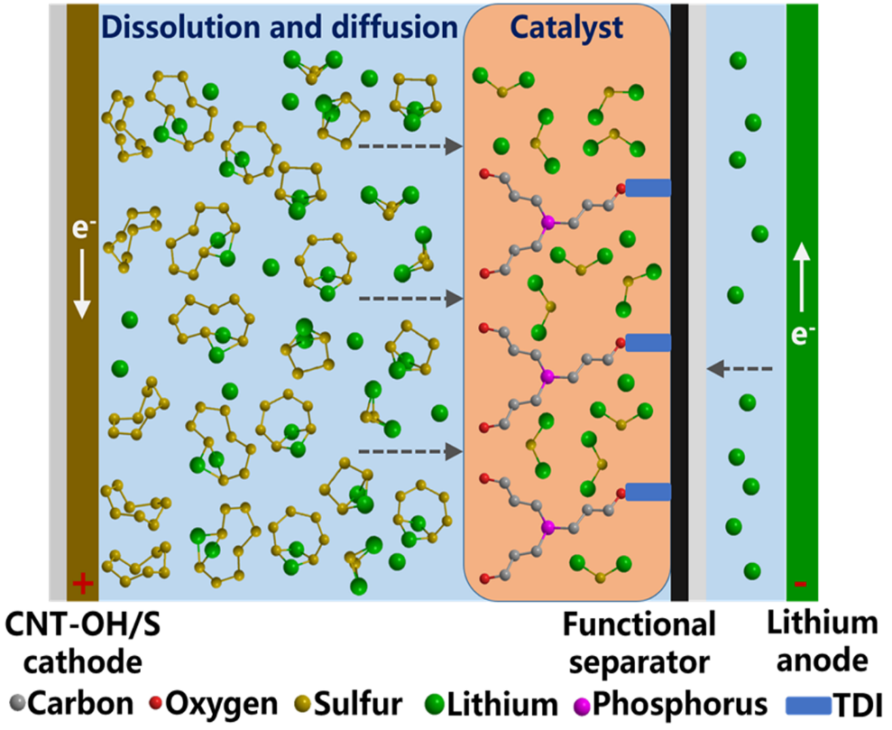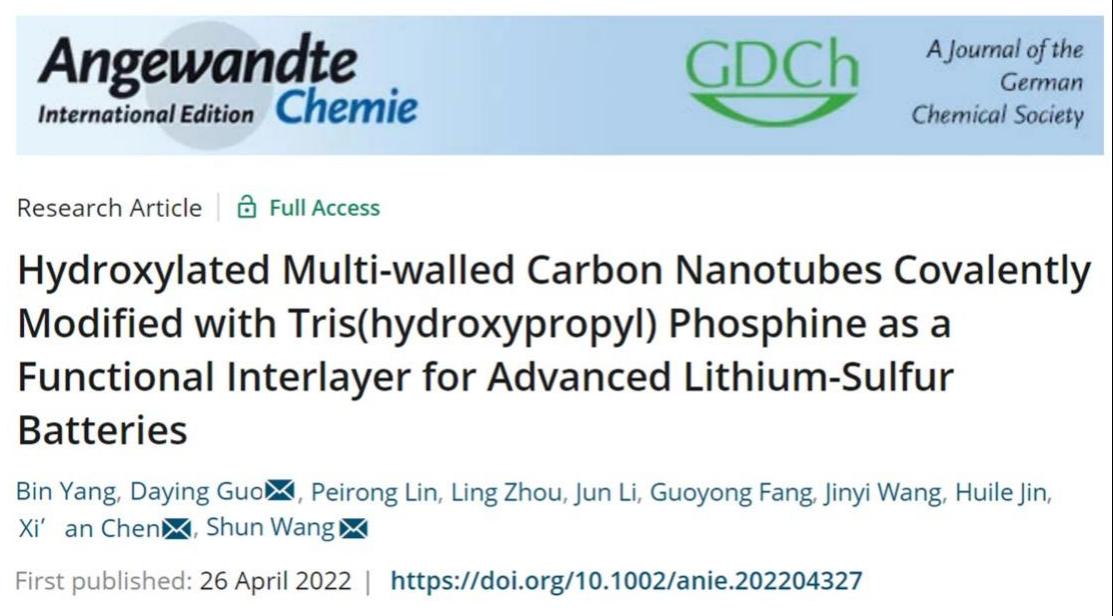 近日,公司陈锡安教授课题组在国际顶级期刊《Angewandte Chemie International Edition》发表题为“Hydroxylated Multi-walled Carbon Nanotubes Covalently Modified with Tris(hydroxypropyl) Phosphine as a Functional Interlayer for Advanced Lithium-Sulfur Batteries”的论文。该工作开发了一种三(羟丙基)膦共价改性羟基化多壁碳纳米管作为先进锂硫电池的功能层。利用三(羟丙基)膦(THPP)作为锂硫电池功能插层中的活性物质,能够快速将液相多硫化锂(Li2Sn, 4≤n≤8)催化转化固相硫化锂(Li2S),从而有效抑制多硫化物穿梭效应。同时能够诱导锂负极表面形成稳定的固体电解液中间相(SEI)层,进而减少锂负极枝晶的形成。并揭示了有机小分子THPP催化多硫化物过程中形成的活性中间体,对锂硫电池中有机小分子催化多硫化物的作用机制提供了一个新的见解。