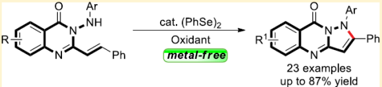 Selenium-Catalyzed Oxidative C−H Amination of (E)‑3-(Arylamino)-2-styrylquinazolin-4(3H)‑ones: A Metal-Free Synthesis of 1,2-Diarylpyrazolo[5,1‑b]quinazolin-9(1H)‑ones