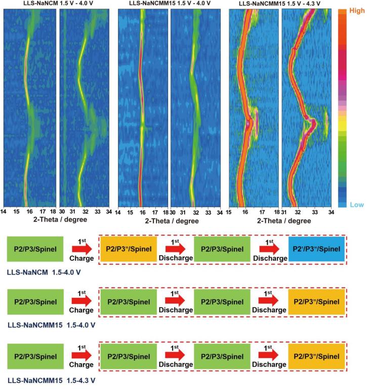 近日,公司云顶7610线路检测碳中和技术创新研究院侴术雷/肖遥团队在国际顶级期刊《Advanced Energy Materials》上发表题为“Strain Engineering by Local Chemistry Manipulation of Triphase Heterostructured Oxide Cathodes to Facilitate Phase Transitions for High-Performance Sodium-Ion Batteries”的研究论文。本文提出一种基于局域化学调控的应变工程策略来调节材料的物理化学性质成功制备出具有三相异质共生结构层状氧化物正极材料Layered/Layered/Spinel-Na0.5Ni0.2Co0.15Mn0.65O2(LLS-NaNCM)和Layered/Layered/Spinel-Na0.5Ni0.05Co0.15Mn0.65Mg0.15O2(LLS-NaNCMM15),研究发现LLS-NaNCMM15正极具有高度可逆的相转变过程。值得注意的是,LLS-NaNCMM15正极材料在1.5 ~ 4.3 V的电压窗口内也表现出高度可逆的晶体结构演变(P2/P3/Spinel→P2/P3″/Spinel)。同时,该电极具有高的可逆容量和优异倍率性能。本文揭示了局域化学调控机制,实现了正极材料的应变工程,为进一步提高钠离子电池的性能奠定了基础。