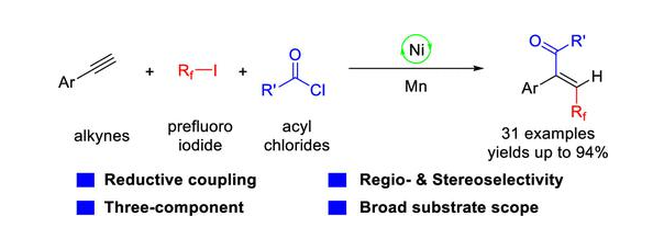 由于氟原子的独特性质,含氟有机化合物广泛应用于农药、医药和材料化学等领域[1]。将氟原子或含氟基团引入有机分子能显著提高分子的亲脂性以及增强其代谢稳定性。近几十年来,芳香化合物的氟烷基化反应已经取得了重大进展,但制备氟烷基化烯烃的有效方法仍未得到充分探索。最近,硕士研究生张珠珠等人在张兴国教授、张小红副教授和涂海勇副教授的指导下发展了一种快速高效的合成氟烷基化烯烃的新方法。该方法研究了在Ni催化剂下,炔烃与氟代烷基卤化物和酰氯的三组分还原氟代烷基化酰基化反应。这种双碳官能化反应具有高产率和优异的区域选择性和立体选择性等优点。相关结果发表在Organic Letters。