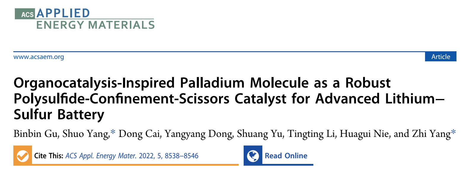 相关研究成果以《Organocatalysis-Inspired Palladium Molecule as a Robust Polysulfide-Confinement-Scissors Catalyst for Advanced Lithium–Sulfur Battery》为题发表在《ACS Applied Energy Materials》杂志上(https://doi.org/10.1021/acsaem.2c01078)。杨植教授、青年教师杨硕博士为通讯作者,公司硕士研究生谷斌斌为第一作者,聂华贵教授、蔡冬博士、研究生东洋洋、于爽、李婷婷等人参与此项工作。相关工作受到国家自然科学基金项目(22109119, 51972238, 22105147,21875166),浙江省自然科学基金项目(LR18E020001,LQ22B030003),温州市重大科技创新攻关项目(ZG2021013)以及温州市一般科研项目(G2020002,H20210006)的支持。