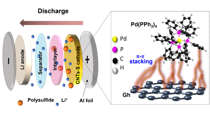 有机金属钯分子因在众多工业合成中都表现出超高的催化活性,从而引起了人们的注意。近期公司杨植教授团队开发了一种四(三苯基膦)钯(TPP)催化剂修饰石墨烯(Gh)的插层膜,应用于Li−S电池正极结构中。结合原位光谱、电化学表征和理论计算研究发现,在Li−S电池体系中,三苯基膦的解离打开了TPP 的盖子,为吸附/催化长链和短链多硫化锂提供了足够的空间和催化活性位点。此外,TPP中存在大量亲锂的P原子,可通过P−Li键促进Li+的传输。由于这种协同效应,含有Gh/TPP的锂硫正极在4.43 mg cm−2的高硫负载条件下,仍显示出优异的循环稳定性(在0.1 C下循环180 圈容量保持率为83.7%,面积容量为2.44 mAh cm−2)。这项工作架起了有机催化和电化学之间的桥梁。