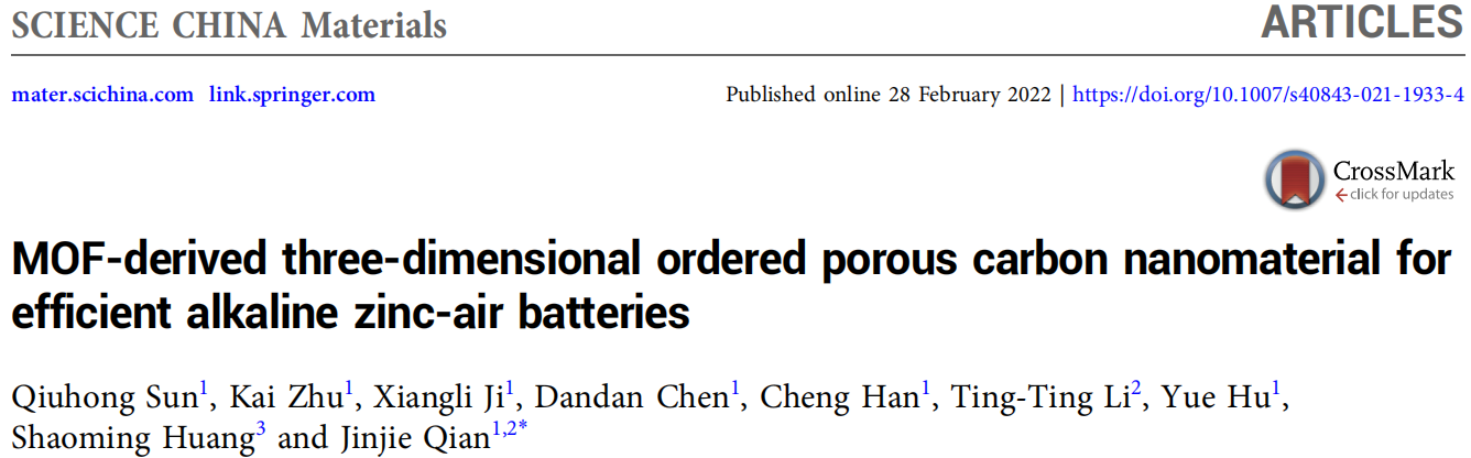 Qiuhong Sun, et al. MOF-derived three-dimensional ordered porous carbon nanomaterial for efficient alkaline zinc-air batteries. Sci. China Mater. (2022).