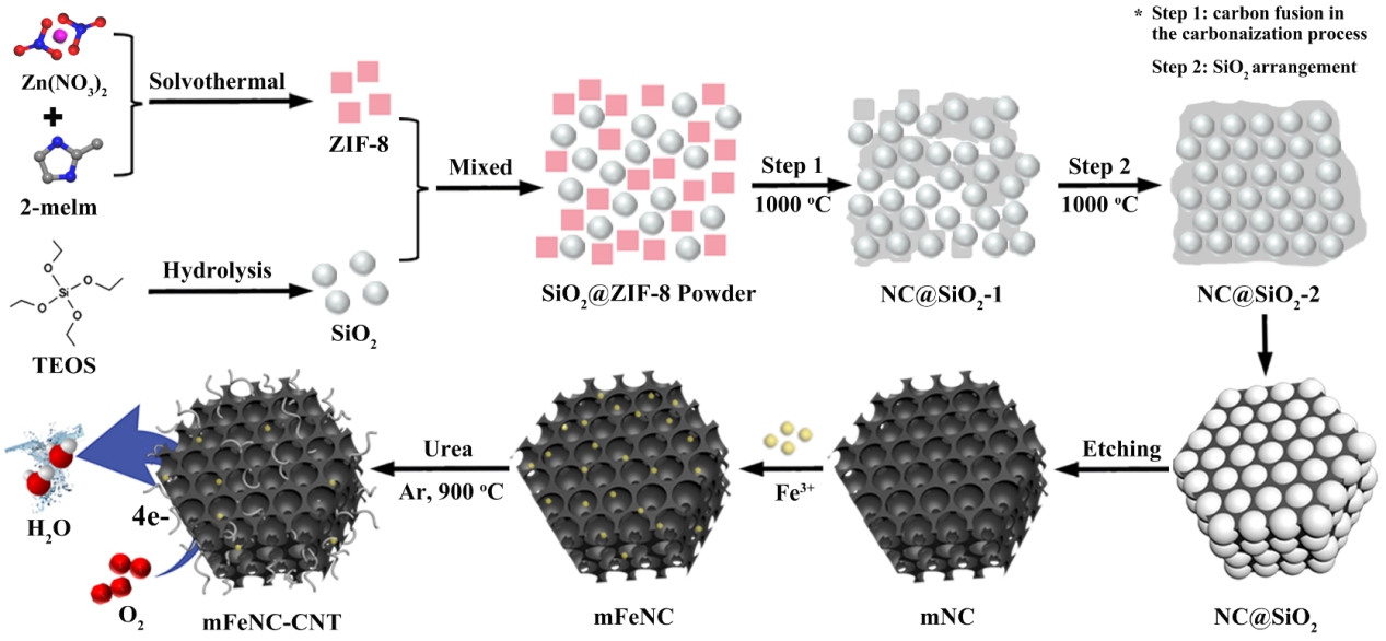 近日,云顶7610线路检测钱金杰副教授等人通过二氧化硅模板法,并以ZIF-8颗粒作为碳源,便捷地合成一种多等级的三维有序多孔碳纳米材料。在进一步通过添加铁源后,高温热解获得的多孔mFeNC-CNT具有超细的Fe纳米颗粒以及由氮掺杂石墨碳配位的原子级分散的Fe-Nx位点。