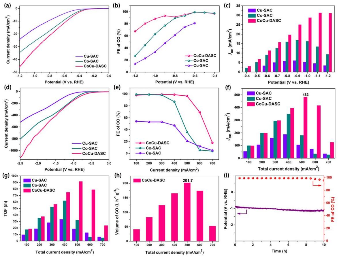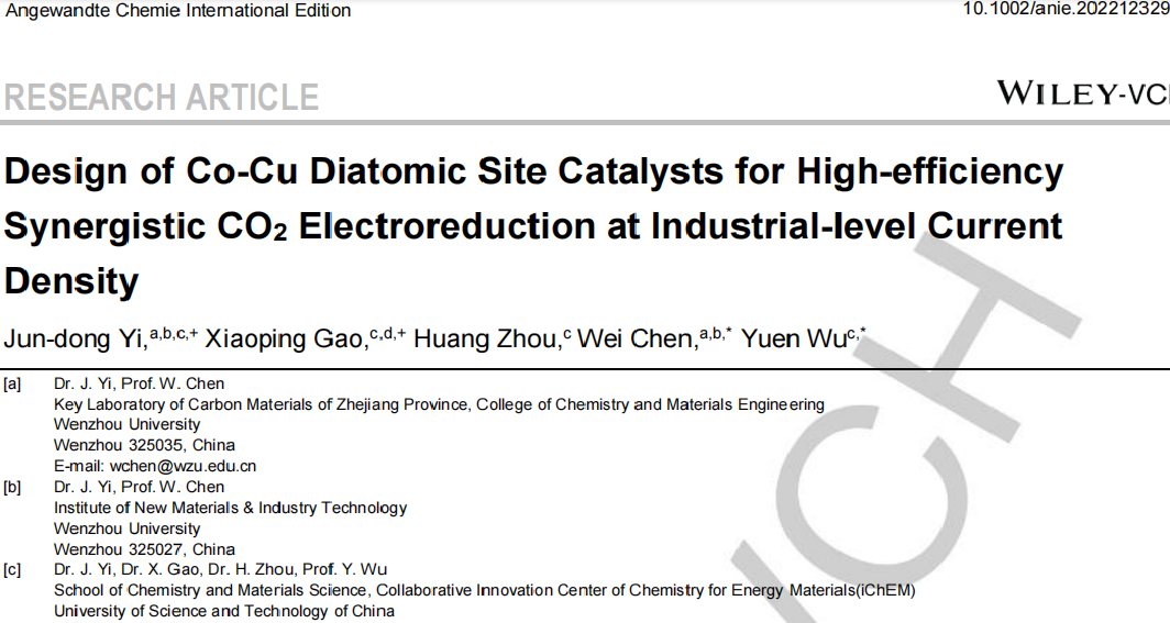 近日,公司陈伟教授和中国科学技术大学吴宇恩教授课题组合作在国际顶级期刊《Angewandte Chemie International Edition》发表题为“Design of Co-Cu Diatomic Site Catalysts for High-efficiency Synergistic CO2 Electroreduction at Industrial-level Current Density”的论文。该工作设计合成了一种新型CoCu双原子催化剂,实现了在大电流下将CO2高效电化学转化为CO。