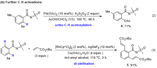 为了探索此种亚砜亚胺类化合物在合成中的应用,作者对产物进行了进一步的衍生化。以产物的亚砜亚胺基团为导向基团,在Pd(II)的催化下,以较高的产率实现了邻位C-H键的乙酰氧基化反应、当以Rh(II)为催化剂时,成功地实现了产物邻位C-H键的烯基化反应。