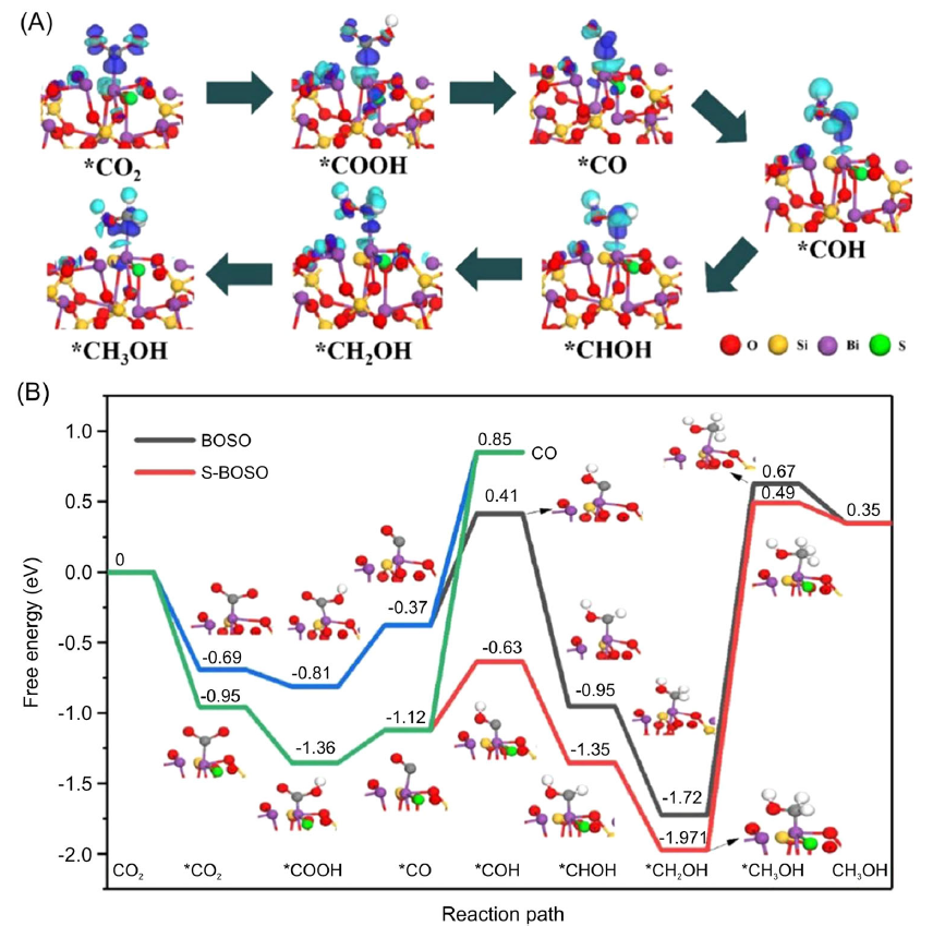 云顶7610线路检测碳中和研究院肖遥团队通过水热辅助表面硫化策略合成了的硫化改性[Bi2O2]2+层硅酸氧铋光催化剂 (S-BOSO),以期获得高效的低浓度CO2还原性能。实验表征结合理论计算从原子层面证明了表面硫化改性的硅酸氧铋纳米片具有电荷富集的铋位点,扩宽了可见光谱吸收,提高了电荷转移效率并构造出丰富的表面活性位。该工作有望推动低浓度CO2还原光催化材料的设计,以实现更广泛的应用。S-BOSO催化性能的提升主要来自于以下三个方面:(1)扩宽的可见光吸收范围;(2)增强的光生载流子分离效率;(3)电荷富集的Bi位点降低了CO2还原反应速率限制步的能垒。该研究为设计具有高活性无机半导体CO2还原光催化剂提供了新思路,也为低浓度CO2转化及太阳燃料光催化剂的设计提供了重要参考。